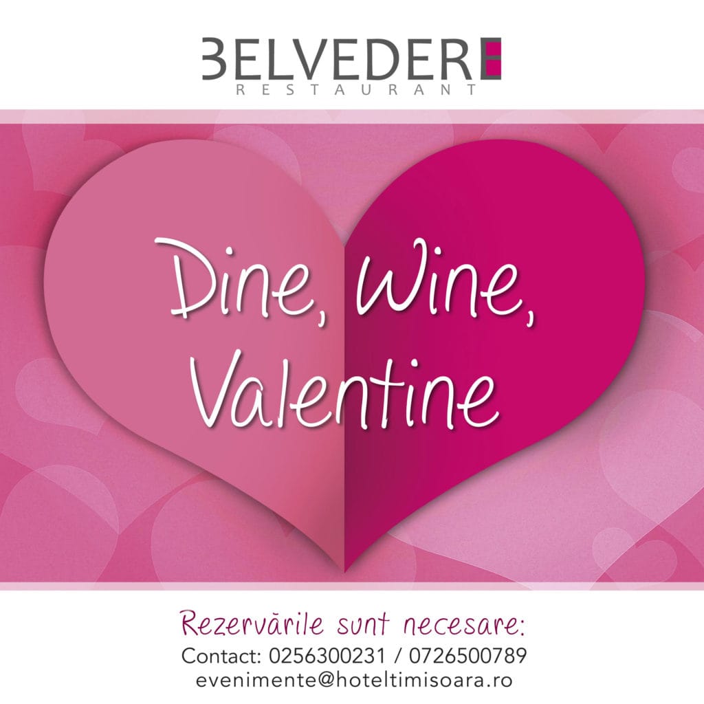 Mie îmi place mesajul de Valentine’s Day al Belvedere Restaurant: Dine. Wine. Valentine. Cu un meniu restrâns, special de Ziua Îndrăgostiților, clienții pot alege între feluri din carne de porc, pui și vită, cu opțiuni pentru garnituri și cu un desert delicios, special conceput pentru această cină. Nu mă pricep la vinuri, iar asta mă face mereu să mă pierd în fața sortimentelor nenumărate. Noroc cu Alex, care e un cunoscător și recomandă vinul potrivit pentru orice combinație. Belvedere Restaurant este unul din cele mai elegante cadre în care se poate sărbători conexiunea dintre doi oameni: profesionalismul ospătarilor, platingul, gustul, elementele de artă contemporană, priveliștea minunată asupra centrului orașului, atmosfera intimă și plăcută, toate acestea au drept scop relaxarea și sentimentul de respect față de evenimentul în sine și față de clienți.